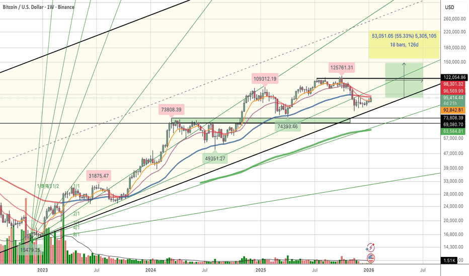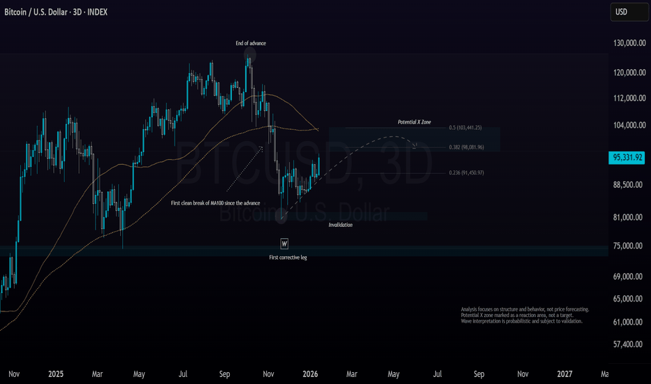 INDEX:BTCUSD BINANCE:BTCUSDT Following the 126 high, Bitcoin shows a clear shift from impulsive to corrective price behavior. The subsequent decline is characterized by overlapping internal structure, momentum deceleration, and a clean break of the 50 and 100 moving averages for the first time since the advance - a behavior typically observed at the early stages of corrective phases, rather than impulsive downtrends. The move toward the 80K region is best interpreted as the first corrective leg (W), supported by non-impulsive price behavior, RSI exhaustion followed by stabilization, and volume/OBV dynamics consistent with selling pressure absorption. This interpretation remains valid unless invalidated by a clear impulsive reversal.... Read more -