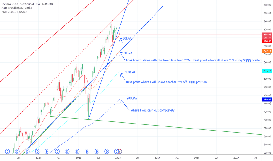 QQQ is now rolling over on the weekly timeframe after an extended deviation above trend, with price losing the 20EMA and beginning a statistically normal but materially bearish mean-reversion sequence. Momentum has stalled near the upper trend channel, and recent candles show distribution rather than consolidation, increasing the probability of further downside toward lower EMA support bands. Key Technical Observations 20EMA (~604): Rejected. This level previously acted as dynamic support during the advance and its loss marks a trend deceleration inflection. 50EMA (~567): Converges with the primary rising trendline from 2024. This is the first mathematically expected downside magnet, not a “buy-the-dip” guarantee. 100EMA (~519): Next high-probability reversion target if the 50EMA fails to hold. A move here would confirm trend exhaustion rather than a shallow pullback. 200EMA (~450): Full-cycle mean reversion. A test of this level would represent a regime shift, not just volatility noise. Price is now below... Read more -