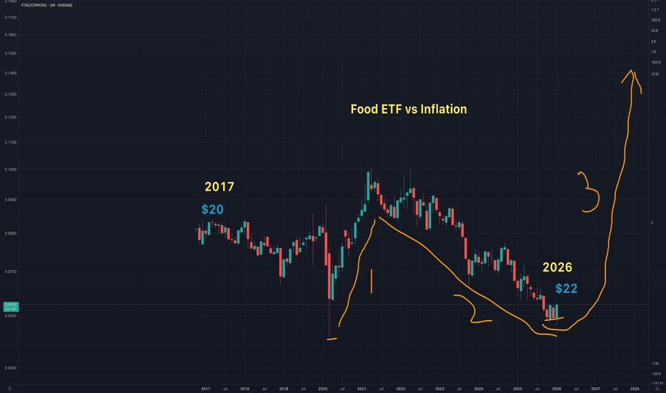 This is a chart of A US Food and Bevvy ETF adjusted for inflation. Stock price is still around 2017 value given all the inflation I think this has a lot of potential upside/catch up to do. Not much chatter in the Food space either which means it's not frothy. This fund hasn't kept up with consumer stables eg. XLP not sure why it's packed with consumer brands This should eventually get dragged up. Risk: NASDAQ ETF sell off/depression/recession but I don't know anyone who can live without food? Thoughts.... Read more -