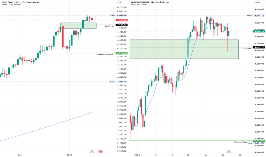 Quick update on Gold using the Daily and 4H charts. On the daily timeframe, Gold reached a key zone and gave a really clean reaction. We had a fair value gap retest and that long wick shows rejection and weakness from sellers — buyers stepped in and defended the area nicely. Structurally, this still looks like a healthy bullish market. On the 4H chart, price did push higher, but then went into consolidation. What I like here is that price actually tried to break lower, tapped into a major yearly support zone, and then immediately pushed back up. To me, that failed breakdown is a sign of strength. Right now, I’m treating this as a potential continuation move, not a chase. I’m patiently waiting for the market to confirm it. Ideally, I’d like to see price retrace into the 4583 – 4571 area on the 4H. If we get a... Read more -