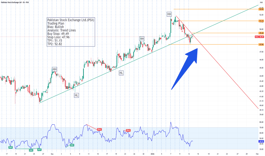 PSX (Pakistan Stock Exchange Ltd.) – Trend-Continuation Trade Plan Price is trading within a well-defined ascending trendline, maintaining a clear structure of higher highs and higher lows. The recent pullback appears corrective rather than impulsive, finding support near the rising trendline and prior demand zone. Key Technical Observations: Price has reacted positively from trendline support, indicating buyers are still in control. The pullback aligns with a descending minor correction, now showing signs of stabilization. RSI has cooled off from overbought conditions and is approaching neutral territory, suggesting room for continuation without divergence. Structure remains intact as long as price holds above 47.96. Trade Plan: Buy Zone: Around 49.49 (trendline + horizontal support confluence) Stop Loss: 47.96 (below structure support) Target 1: 51.15 (previous resistance / range high) Target 2: 52.82 (trend extension & measured move) Invalidation: A daily close below the trendline and 47.96 would invalidate the bullish setup and... Read more -