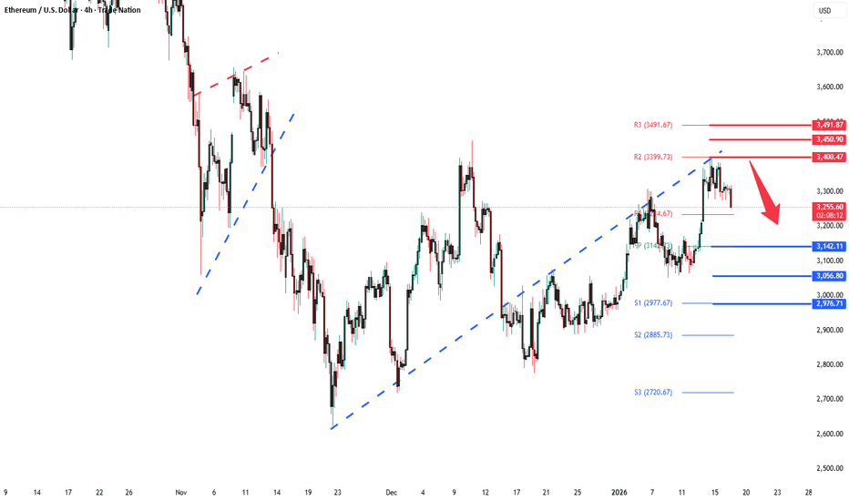 The ETHUSD pair continues to display a bearish outlook, in line with the prevailing downward trend. Recent price action suggests a corrective pullback, potentially setting up for another move lower if resistance holds. Key Level: 3,400 This zone, previously a consolidation area, now acts as a significant resistance level. A failed test and rejection at 3,400 would likely resume the bearish momentum. Downside targets include: 3,140 – Initial support 3,056 – Intermediate support 2,976 – Longer-term support level Bullish Scenario (breakout above 3,400): A confirmed breakout and daily close above 3,400 would invalidate the bearish setup. In that case, potential upside resistance levels are: 3,450 – First resistance 3,490 – Further upside target Conclusion ETHUSD remains under bearish pressure, with the 3,400 level acting as a key inflection point. As long as price remains below this level, the bias favours further downside. Traders should watch for price confirmation around that... Read more -