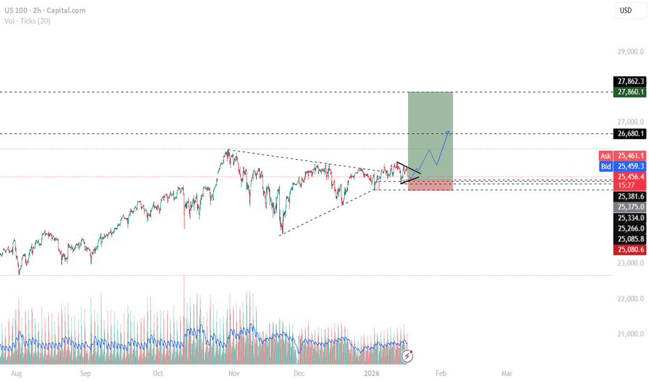 Symbol: US100 Timeframe: 2H Bias: Bullish Trade Type: Swing / Intraday Continuation Market Structure Overview US100 remains in a broader bullish trend, printing higher highs and higher lows. After the recent impulsive rally, price entered a compression phase, forming a tightening structure (symmetrical wedge) just above key support. This consolidation suggests pause before expansion, not distribution. Price Action Analysi s Price is respecting higher lows, showing buyers are stepping in earlier Structure remains bullish as long as price holds above the highlighted demand zone Current price action suggests a break-and-hold scenario, not a fake breakout Compression near highs often precedes strong directional moves Volume Analysis (Key Confirmation) 🔹 Volume expanded during impulsive bullish moves, confirming strong participation from buyers 🔹 Volume contracted during consolidation, indicating reduced selling pressure rather than aggressive distribution 🔹 No significant volume spike on bearish candles → sellers lack conviction 🔹 Rising volume near the consolidation... Read more -