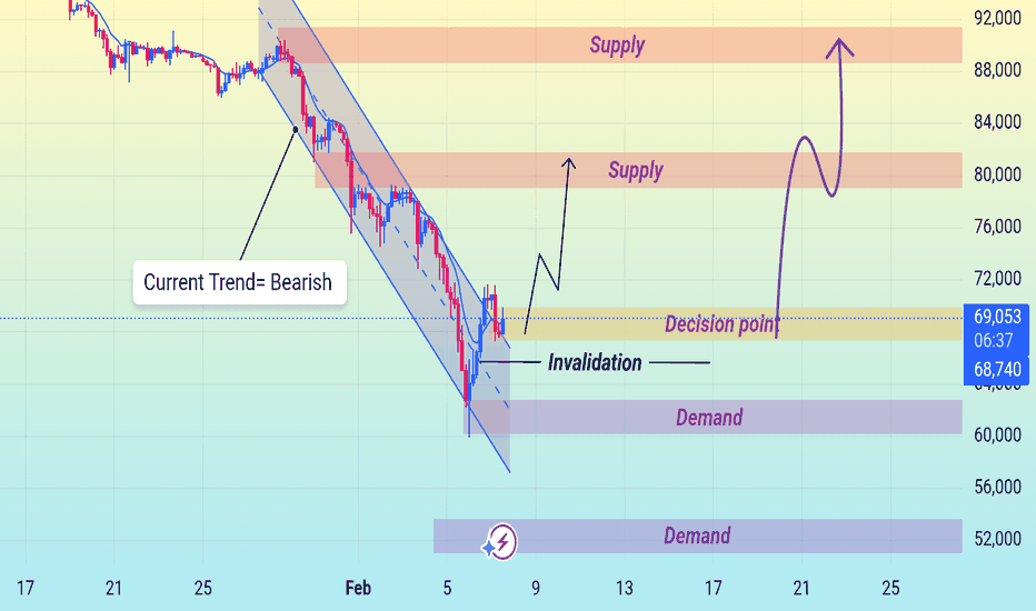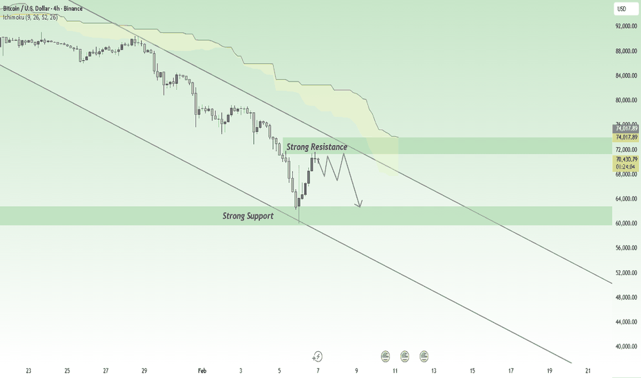 If we set emotions aside and look at the market through a pure trend-following lens , BTCUSD is currently in a state of “a rebound within a broader downtrend” rather than a genuine recovery. The recent price bounces are largely driven by short-covering after panic selling, not by a clear return of strong institutional capital. With market sentiment still cautious, every rally risks turning into an opportunity for distribution. From a structural perspective, Bitcoin has completely broken its previous bullish base and has entered a clearly defined descending channel on H4. Price remains trapped below the Ichimoku cloud, signaling that the dominant trend has not changed. The bounce from the lows has only produced a lower high, confirming that buyers currently lack the strength to regain control. The 71,000–71,300 zone stands out as a critical price ceiling. This area is a confluence of the descending trendline and key technical resistance... Read more -