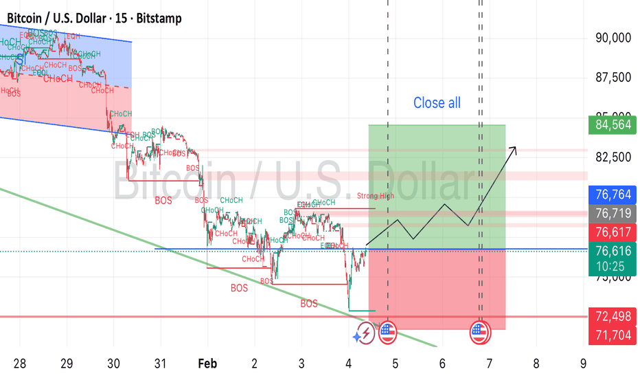 Bitcoin is currently trading in a short-term bearish structure, confirmed by multiple BOS (Break of Structure) and CHoCH (Change of Character) signals on the 15-minute timeframe. Price recently swept liquidity below the previous lows and reacted strongly from a key demand/support zone, signaling potential seller exhaustion. The red area marks a strong buy zone where smart money may have entered positions. If price holds above this level and breaks internal structure, a bullish continuation toward the upper resistance zone is expected, as highlighted in the green area. The “Close all” zone represents a major profit-taking area near strong highs... Read more -