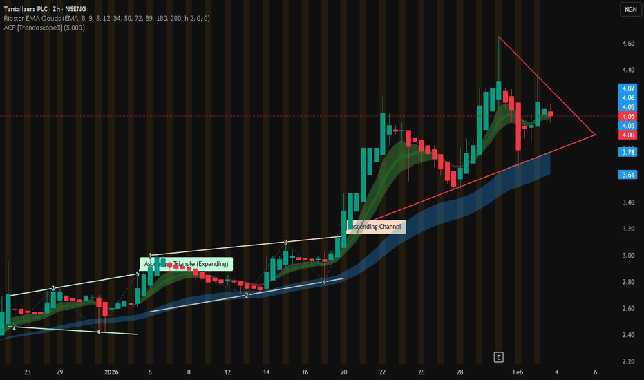 ❖ ❖ ❖ DO YOUR DUE DILIGENCE 🟦 TRADE PACKET — Tantalizers Plc (2H Chart) Patterns: Ascending Triangle (Expanding) + Ascending Channel + Symmetrical Triangle Indicators: Ripster EMA Clouds (5–200) Price: ₦4.05 🟩 BUY Zone ₦3.78 – ₦4.03 Confluence of triangle support + lower channel boundary EMA(72/89) cluster sits just below price, offering dynamic support Best R:R entry sits around ₦3.90 – ₦4.00 if price retests the triangle base 🟥 Stop‑Loss Zone ₦3.61 Below the expanding‑triangle support and EMA(180/200) Protects against breakdown from the symmetrical triangle apex 🟦 Exit / Take‑Profit Zone ₦4.60 – ₦4.75 Upper boundary of the ascending channel + measured move from triangle Trail stop once price clears ₦4.30, which is the key breakout confirmation level. ❖ ❖ ❖ DO YOUR DUE DILIGENCE... Read more -