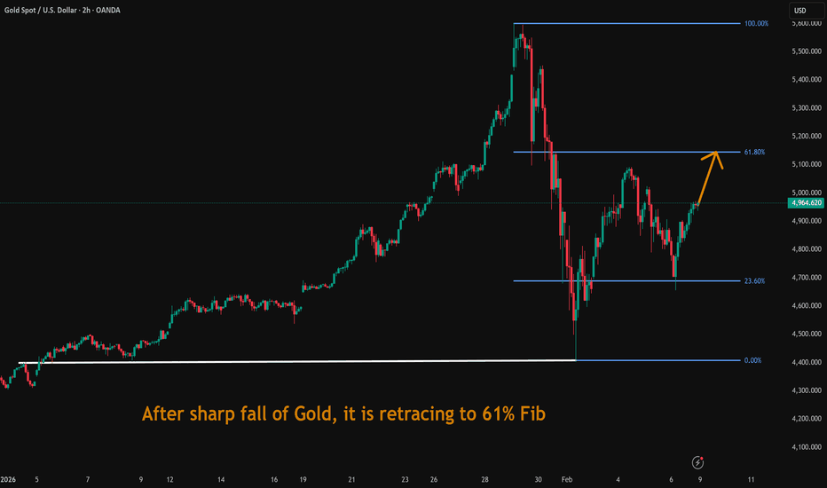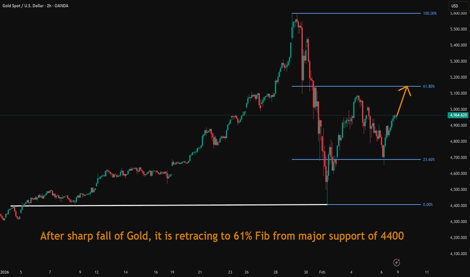 After sharp fall of Gold, it is retracing to 61% Fib from major