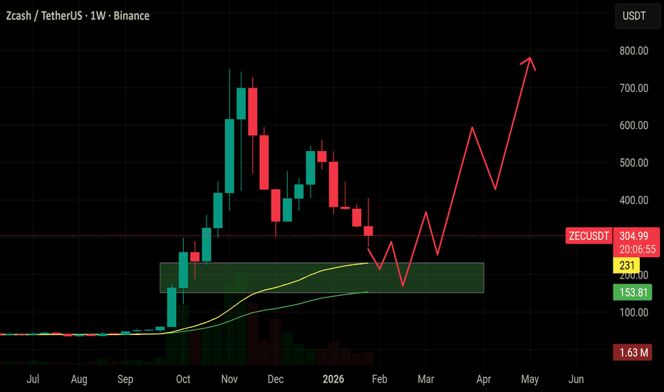 $ZEC/USDT Bullish Analysis #Zcash remains in a broader bullish structure on the weekly timeframe, but it is currently in a corrective phase. The 1W 50 EMA, marked in yellow, is acting as the first dynamic support zone. Price is approaching this level and is likely to test it, making this area a key decision point for the next move. The 1W 99 EMA, marked in green, is the secondary support. This EMA aligns closely with the major demand zone and serves as the last strong support for maintaining the bullish market structure. Key support lies between $233 and $155. This zone has historically attracted strong buying interest and now coincides with both the 1W 50 EMA and 1W 99 EMA, increasing the probability of a bullish reaction from this area. The current price action appears to be a healthy correction within a larger bullish cycle, not a confirmed reversal yet.... Read more -
