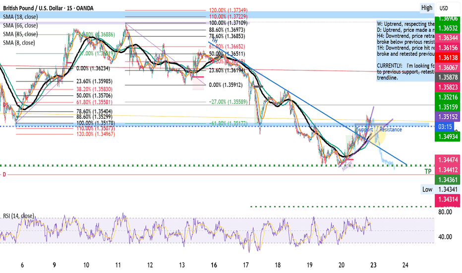 D: Uptrend, price made a new high H4: Downtrend, price retraced 50% and broke below previous resistance 1H: Downtrend, price hit retraced 38.2% and broke and retested previous support. CURRENTLY: I'm looking for price to go short to previous support, retesting downward trendline.... Read more -
