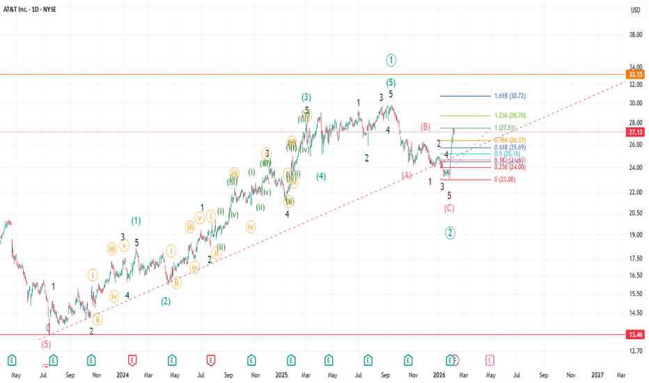The reaction from $23 support fueled by excellent earnings and stable outlook has been very positive. I got filled on 1 of 3 orders. I was expecting the price to get down a bit more, but it turned on the top target and had this wonderful recovery. Only thing is, every time in history, whenever T has a price pump like this, it has met with severe downturn and many times, a lower low. The question here is, is T going to start a major bull market of wave 3 of several degrees or are we in for a bull trap that will drag the correction on for many more months. Either way, the good news is, the structure moving up from $23 is a 5 waves move. It is possible to extend the 5th wave a bit more, but more or less the structure looks complete. We need to... Read more -