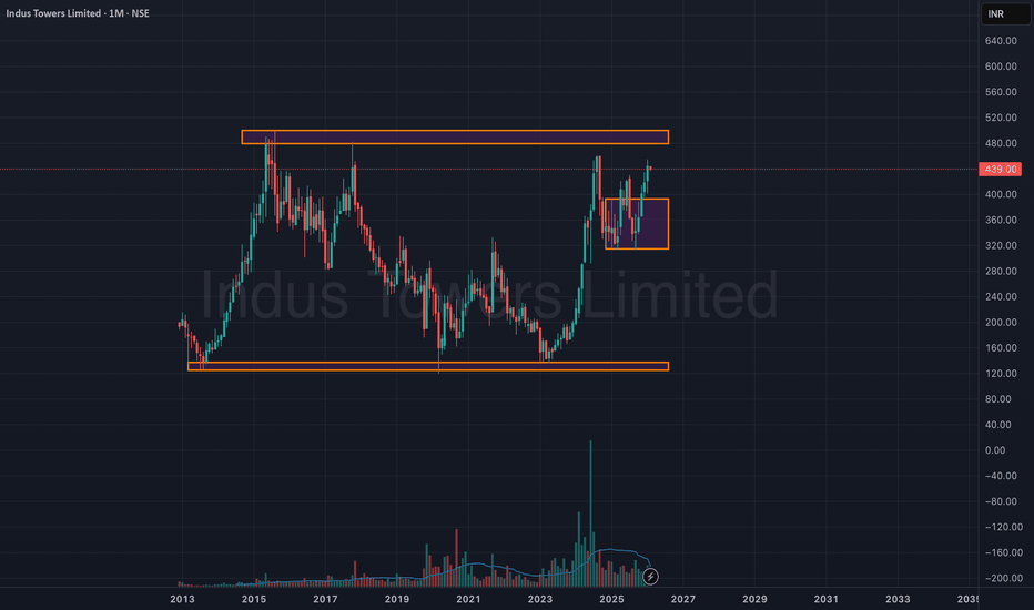 Indus Towers is currently trading near a major long-term resistance zone, which has historically acted as a supply-heavy distribution area. The current structure is important because price is no longer in a downtrend — it is transitioning into a range-to-trend decision phase. Market Structure Overview Price has completed a full mean-reversion cycle from multi-year lows. Strong rally from the long-term demand zone (~₹130–₹150). Current price is testing a decade-old resistance band (~₹460–₹500). Structure resembles a range expansion attempt, not a confirmed breakout yet. This makes the current zone a decision zone, not a chase zone. Key Zones Identified Major Resistance (Supply Zone): ₹460 – ₹500 → Historical rejection zone → Multiple monthly wicks earlier Intermediate Demand / Base: ₹330 – ₹380 → Recent consolidation box → Acts as first support on pullbacks Major Long-Term Support: ₹130 – ₹160 → Multi-year accumulation zone → Structural bottom already validated Volume Analysis Expansion... Read more -