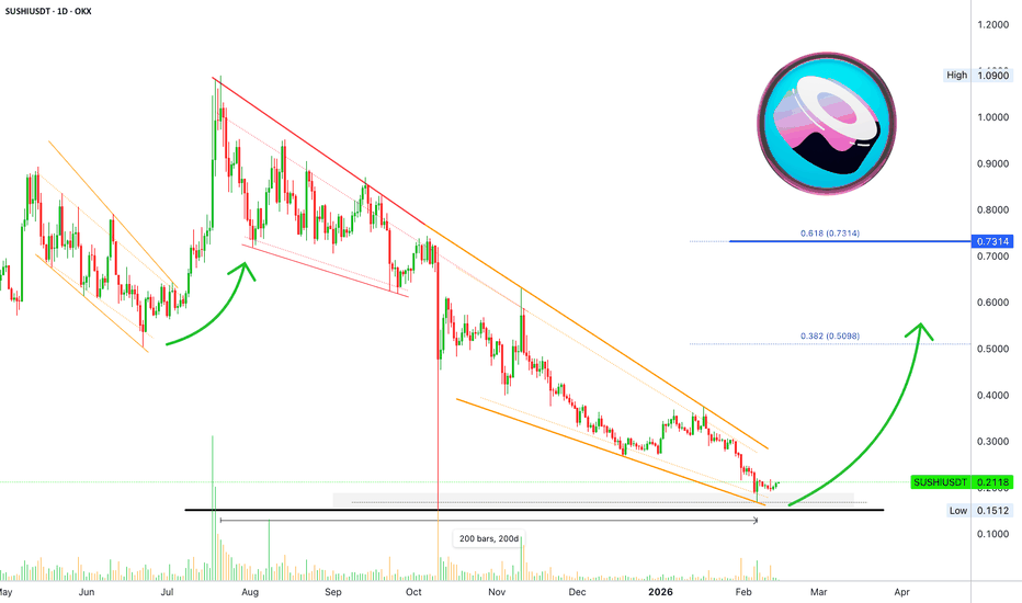 The correction started July 2025. The exact same date Coinbase (COIN) peaked, ending its previous bullish cycle. It is interesting how everything happens at the exact same time. Looking around, can clear all doubts. Sushiswap went bearish for exactly 200 days, until 6-February 2026 starting from a high point 21-July 2025. And that's it, lower is not possible nor needed. The 6-February 2026 low is a higher lower compared to the October 2025 market flush. It is the lowest ever, a true all-time low. And, even now, as Sushiswap plans to recover, it is trading at the lowest support range in its history. A perfect entry zone in anticipation of long-term growth. Now, here is a target of $0.73 mapped on the chart. I will not even say within 3 months because 3 months is a very long time, specially if the market is rising continually, which hasn't happened in... Read more -