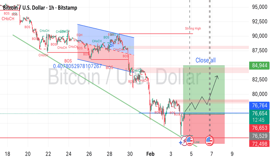 Bitcoin is currently trading in a clear downtrend on the 1-hour timeframe, confirmed by multiple BOS (Break of Structure) and CHoCH (Change of Character) signals. Price has respected the descending trendline and continued making lower highs and lower lows. Recently, price swept liquidity below the previous lows and formed a weak low, suggesting selling pressure may be weakening. The red zone marks a strong demand/support area, where buyers are expected to step in. If price holds this support and breaks above the internal structure, a bullish correction or reversal toward the upper supply zone is possible, as shown in the green area. The “Close all” zone indicates a potential profit-taking area for long positions. ⚠️ Always trade with proper risk management and wait for confirmation before entering.... Read more -