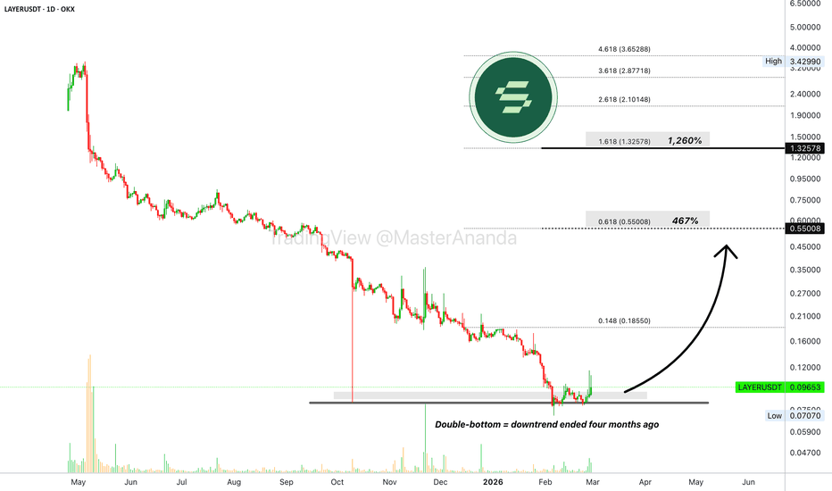 The bottom is in. Again? The bottom is in but I still have my doubts. First, October 2025. A long wick works to remove all support. Months of bearish action and a reversal starts to happen right at the same wick low, four months after the first low. The bottom range for LAYERUSDT (Solayer) was first activated in October 2025. The market flush activated this level for only a few minutes at best, not even one hour. Minutes literally and then the market recovers just to start a long-term decline. The level that was activated for minutes only in October 2025, was challenged for weeks in February 2026. LAYERUSDT found support right below the October 2025 low, a price tag around $0.081. There was a lower low but this is the price level for the gray line shown on the chart. Minutes vs weeks In February 2026, a shy lower... Read more -