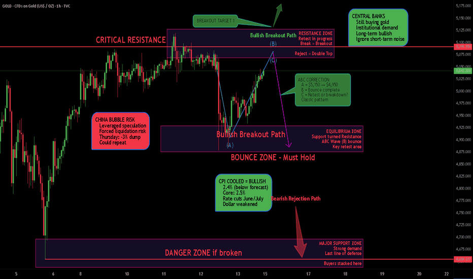 Yo traders! 👋 Gold just bounced HARD from $4,950 and is now knocking on the door of $5,100 resistance. Let me break down what's happening on the 1-hour chart. The Setup XAUUSD is trading at $5,042 after recovering from Thursday's brutal 3% dump. We're seeing a potential ABC correction pattern playing out - price dropped from $5,150 (A), found support at $4,950 (B), and now we're in the (C) wave testing resistance again. The question: Is this a retest before breakout, or a double-top before another leg down? Why This Setup is Interesting Bounced perfectly from the middle purple zone ($4,850-$4,950) Now retesting upper resistance zone ($5,100-$5,150) US inflation came in COOLER than expected (2.4% vs forecast) - bullish But China speculative bubble concerns = volatility incoming Rate cuts pushed to June/July - mixed signal Central banks still buying - long-term bullish The News is MIXED (Key Context) Bullish factors:... Read more -