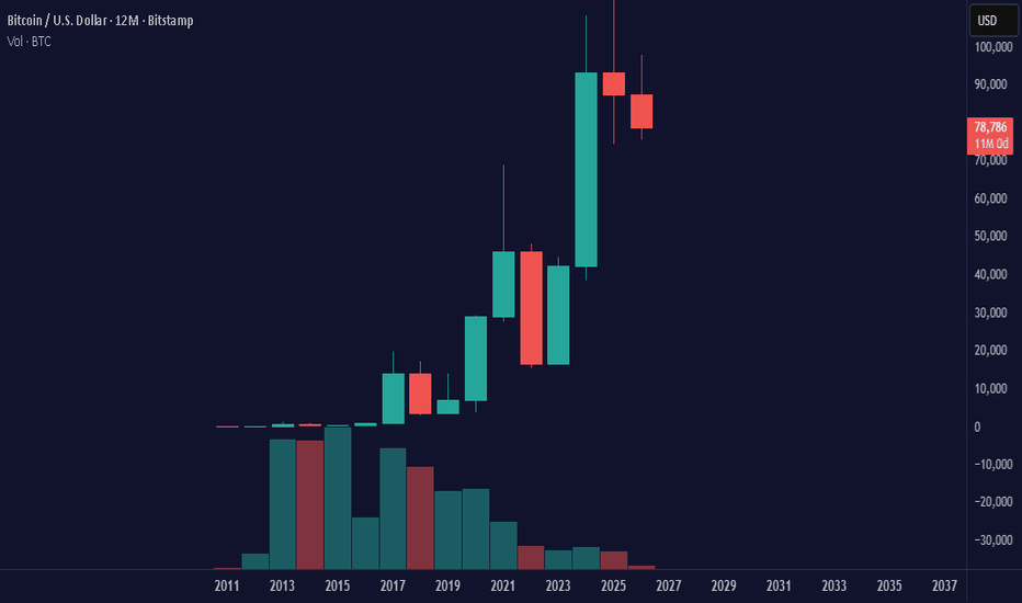 Macro Trend Bitcoin is still in a long-term bullish structure. Each cycle shows higher highs and higher lows since inception. The move from ~20k to ~90k happened in very few monthly candles, which signals a parabolic phase rather than healthy trend growth. 2. Current Candle Structure The most recent candles show: Large bullish impulse followed by Strong rejection wicks and consecutive red monthly candles This usually indicates profit-taking and distribution, not immediate trend continuation. 3. Volatility & Momentum The current red candle (~-10%) after a blow-off green candle suggests: Momentum is cooling Buyers are no longer in full control Historically, after similar structures (2013, 2017, 2021), BTC entered extended consolidation or deep pullbacks. 4. Volume Insight Volume peaked during the explosive green candles and is now declining, which often means: Smart money already positioned Late buyers are absorbing supply 5. Key Levels to Watch 78k–80k: Current support (short-term) 60k–65k: Strong... Read more -