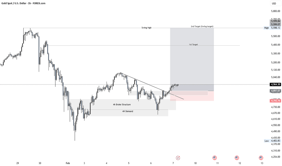 XAUUSD – Weekly Outlook (Based on H1 / H4 Structure) Gold has shown a shift in market structure after reacting strongly from the H4 demand zone, where buyers stepped in and protected the lows. Price has since broken the short-term bearish structure and pushed higher, confirming bullish intent on the lower timeframe. Following the structure break, price consolidated and then broke above the descending trendline, signaling a potential continuation move to the upside. Current price is holding above the breakout area, suggesting acceptance rather than a false break. Bias: Bullish continuation As long as price holds above the prior structure and demand support, bullish setups remain valid. The marked zone acts as a key pullback / mitigation area for continuation entries. Targets: 1st Target: Prior internal high / resistance zone (marked on chart) 2nd Target (Swing Target): Previous swing high, which aligns with higher-timeframe liquidity Invalidation: A strong close back... Read more -