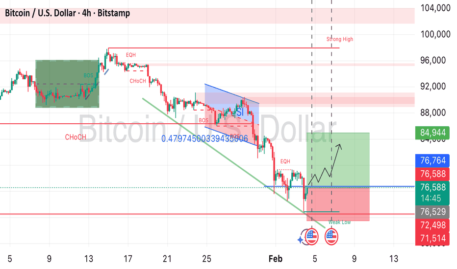 BTCUSD 4H – Bearish Structure with Potential Reversal Zone
