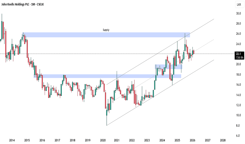 This monthly chart for John Keells Holdings reveals a stock in a long-term recovery phase, characterized by a steady ascending channel that began after the 2020 lows. Here is a breakdown of the key technical elements: Key Observations Ascending Channel: Since 2020, the stock has been respecting a rising price channel. It is currently trading near the median line (dotted), suggesting a balanced momentum between buyers and sellers. Major Supply Zone: There is a significant overhead resistance (Supply) zone between 25.0 and 26.0. This area has historically capped price increases (notably in 2015 and recently in 2025), leading to sell-offs. Support Levels: The price recently consolidated above the 18.0 - 20.0 range, which has transitioned from a resistance area to a "demand" or support zone. Current Price Action: At 22.1, the stock is in a minor retracement. It is holding above its previous local lows, indicating that the multi-year uptrend... Read more -