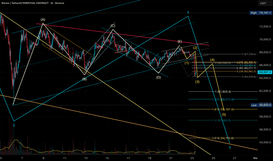 ABCDE triangle in 4th wave completed. 5th wave in progress. In wave 5, 123 completed and 4 in progress and could go to 66k before the 5th wave that could take out 5he previous swing low. This would complete the primary wave A and we get an ABC correction to the upside.... Read more -