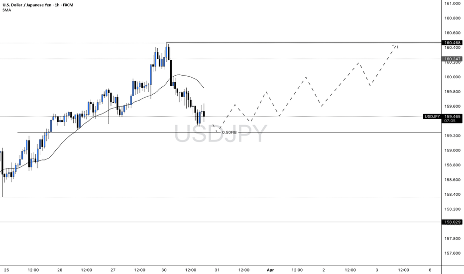I’m looking at USDJPY on the 1H chart. Price made a strong bullish move and pushed all the way into the highs around 160.46. After that, the market started pulling back. For me this pullback still looks corrective, not like a full trend reversal. The key area I’m watching is around 159.100-250 where the 0.50 Fibonacci sits. That level also lines up with previous structure, so for me it is an important reaction zone. If price keeps coming lower into that area and holds, I would expect buyers to step in again. The bigger idea here is simple. The market already showed strong bullish intent with that expansion to the upside. So now I want to see if this retracement can find support in discount before continuing higher.... Read more -