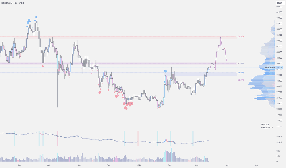 KUCOIN:HYPEUSDT | 1D Could see price push into $40–44, likely some reaction there since that zone previously acted as support before the breakdown. If $35–36 holds, could see it retesting $45–48, maybe even $52–54 (range high retest) on extension. For now, watching r1 $40–44 key support: s1 = $35-36 key resistance: r1 - $40–44 r2 - $45–48 r3 - $52–54... Read more -