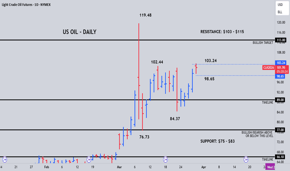 US Oil is currently at short term resistance and my expectation is for a move to the downside to start this coming week (30th March). Should current levels be broken to the upside, $110-$115 is the next target higher. Should Oil start to decline this week a re-test of the $77 level is first target. If Oil can close and stay below this level then $60 to $70 is the next potential downside target short term depending on the volatility. Bearish sentiment could potentially continue into May/June with further potential downside targets.... Read more -