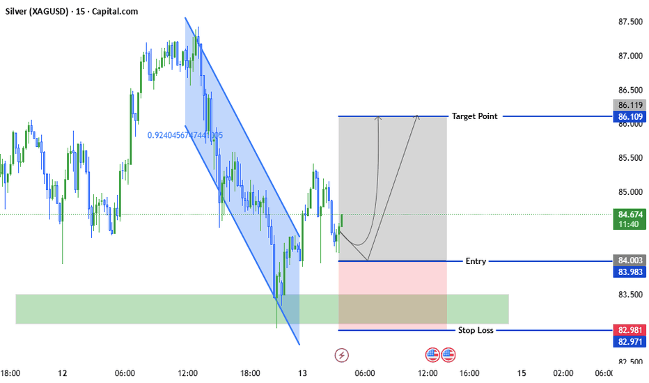 Price previously moved inside a clear descending channel, showing strong bearish momentum. The market then broke out of the channel and created a strong bounce. After the bounce, price is pulling back toward a demand/support zone. This indicates a possible trend shift or bullish retracement opportunity. Key Demand Zone The green area around 83.40 – 83.60 represents a strong demand zone where buyers previously stepped in. Reasons this zone is important: Previous liquidity sweep Support reaction area Institutional accumulation zone Trade Setup Potential Buy Setup Entry: 84.00 Stop Loss: 82.98 Target: 86.10 This gives approximately 1:2 risk-to-reward, which is a healthy intraday setup.... Read more -