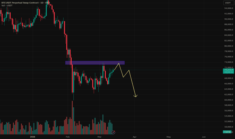 Price is approaching a strong supply zone around 73K–75K. If we see rejection in this area, short positions could be considered. Potential downside targets: 68K – 65K – 62K. Invalidation if price breaks and holds above 75K. #SmartMoney #Liquidity #Noliquid #MarketStructure... Read more -