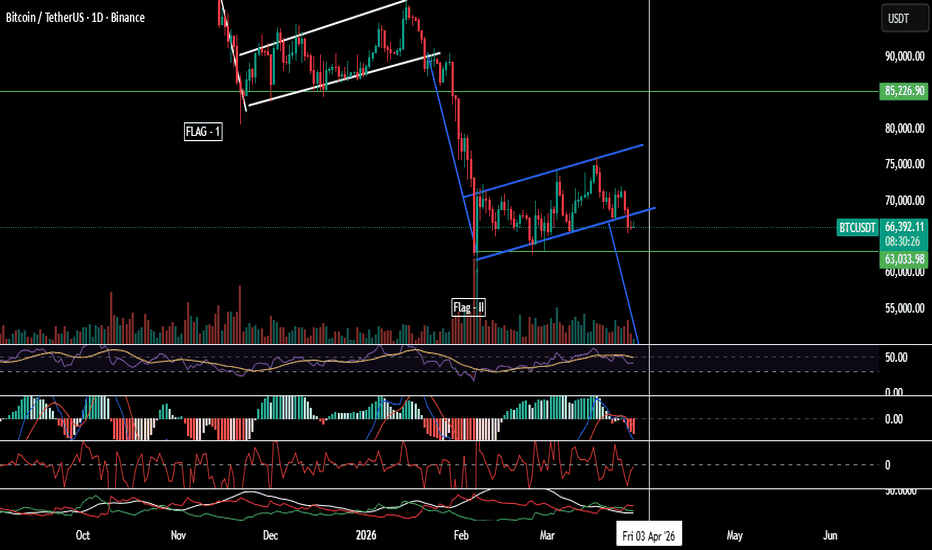 Taking reference from our previous analysis, the bearish stance on Bitcoin remains firmly intact. As highlighted earlier, a bearish flag and pole formation was developing on the daily timeframe. The structure is now nearing confirmation, with price compressing toward the key support zone. The 63K level is critical — a decisive break below this support is likely to trigger the next leg of the sell-off. Market Outlook Trend: Bearish Pattern: Bearish Flag Breakdown Setup Trigger Level: 63,000 Expectation Once the 63K support is broken, the market may witness an accelerated move towards the downside, with 39K acting as a potential target zone. Strategy 📉 Bias: Sell on breakdown / sell on strength Avoid initiating long positions in current structure Short positions may be considered with defined risk management Prefer entries either on breakdown confirmation or pullbacks Conclusion BTC remains under strong bearish control, and the current structure suggests a continuation... Read more