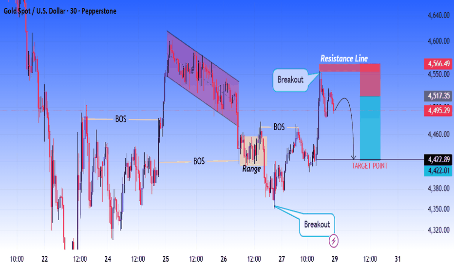 Gold is showing a clear structural shift after multiple Break of Structure (BOS) confirmations, indicating a transition from consolidation into a trending phase. After forming a descending channel, price broke out aggressively and created a tight range accumulation zone, signaling indecision before expansion. This range was eventually broken to the upside, leading into a key resistance area. Currently, price is reacting from this resistance zone, suggesting a potential rejection. If sellers step in, we can expect a move toward the marked target zone around 4422, which aligns with previous structure and liquidity. Key Confluences: Multiple BOS confirming market structure shifts Range formation → breakout continuation pattern Strong resistance zone rejection Clean downside target aligned with structure Trade Idea: Look for bearish confirmation near resistance Target: 4422 zone Invalidation: Sustained break above resistance ⚠️ Wait for confirmation before entering. Manage risk properly.... Read more -