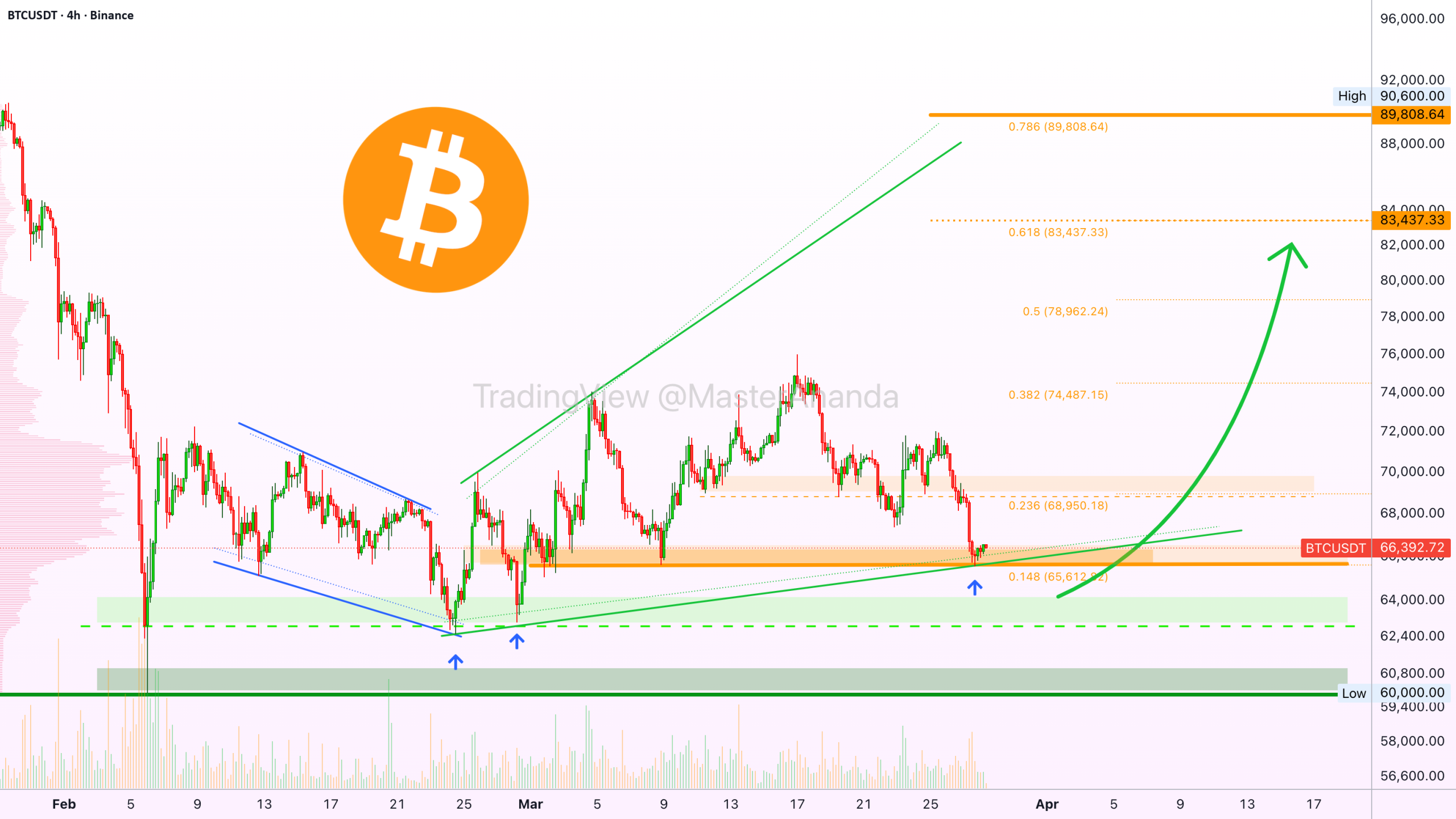 We've been looking at Bitcoin on the short-term timeframe, 4H. It is time to zoom-out and consider the bigger picture. The retrace is over. BTCUSDT closed three days red. Two days produced significant bearish action and yesterday nothing. Today, I am seeing the start of green. I published a signal with entry range up to $67,000, still active now. See here: https://www.tradingview.com/chart/BTCUSDT/GIruzLQz-Bitcoin-BTCUSDT-25X-Long-trade-numbers-with-2-058-potential/ $74,500 will be a barrier on the way up. This level worked as resistance 4-March and then again 17-March. This is the main level to break for higher prices. Third time is the winner. We go higher. It is easy to predict a higher high based on the double-bottom and higher low. Also, while $74,500 worked as resistance, the 17-March high was $76,000. The bulls are gaining ground. The market has been producing slow and steady growth but it never stays the same. A long period we have... Read more -