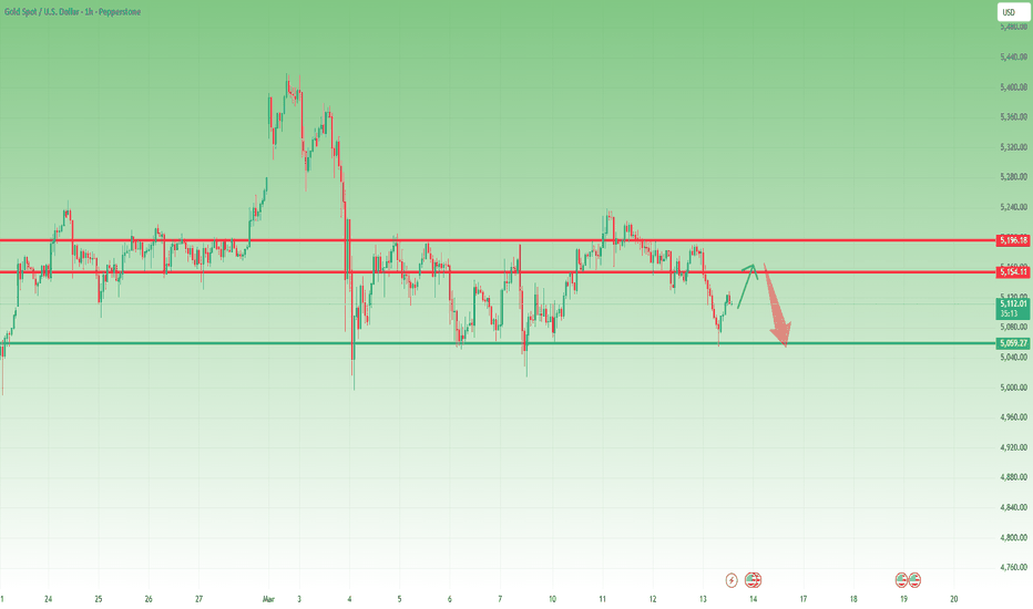 📊 Technical Analysis (XAU/USD) PEPPERSTONE:XAUUSD On the 60-minute (60M) chart dated March 13, 2026, Gold (XAU/USD) is currently under technical pressure, slumping to approximately $5,090 during the early Asian session. The price action has broken below the $5,100 psychological level and is now actively testing a high-confluence Support Zone between $5,084.03 – $5,096.43. This zone is critically reinforced by a major ascending trendline that has historically served as a floor for the metal's primary uptrend. The technical structure highlights a firm Resistance Zone situated between $5,175.96 – $5,188.95. While the immediate bias is bearish, the metal's current position near the trendline support suggests a potential technical bounce if buyers can defend this level ahead of high-impact US data. Short-term bias: Bearish while below $5,175; neutral/bullish if the trendline support holds. Key Resistance: $5,175.96 – $5,188.95. Key Support: $5,084.03 – $5,096.43. 🎯 Trade Setup (Support Bounce Scenario) Entry Zone: $5,085 –... Read more -