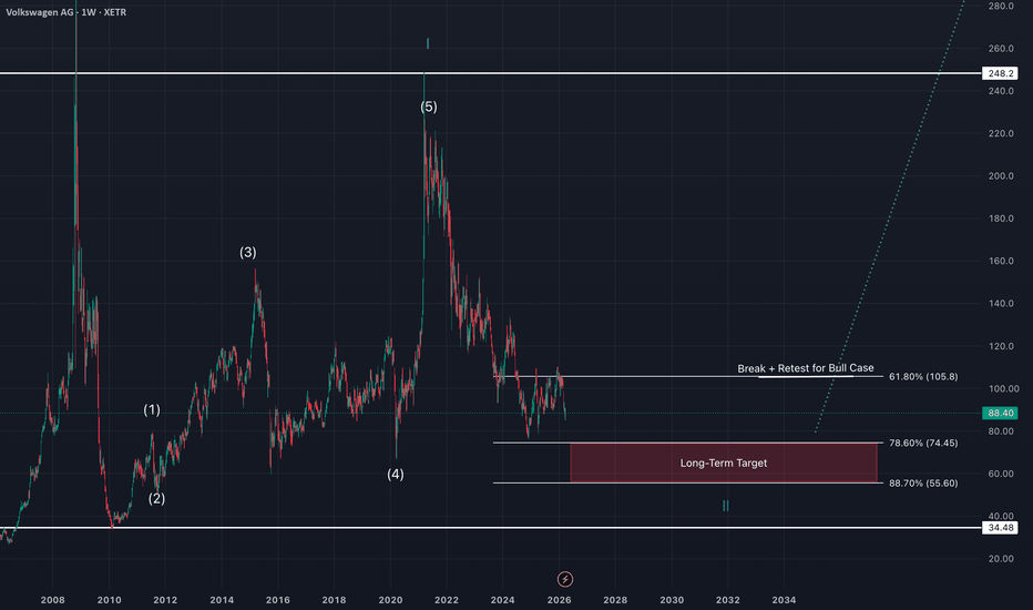 Volkswagen appears to have completed a full 5-wave impulse cycle, topping out around the 2021 highs. Since then, price action has transitioned into a broader corrective phase, likely unfolding as an ABC structure. Wave A marked the initial sell-off, followed by a Wave B recovery. Currently, price action suggests we are in Wave C, which typically represents the final leg of a correction. From a structural perspective, the trend remains weak: Lower highs and lower lows No confirmed reversal yet Price trading below key retracement levels Key Levels 61.8% retracement (~105€): First major resistance 78.6% – 88.7% zone (~55–75€): High-probability demand zone Long-term support (~34€): Historical floor My Plan (Long Setup) I am not looking to enter at current levels. Instead, I’m watching for price to move into the 55€–75€ zone, which aligns with: Deep Fibonacci retracement levels Potential completion of Wave C Long-term value area within the broader range... Read more -