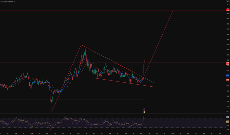 WTI breaking out of a flag, targeting $200 per barrel.