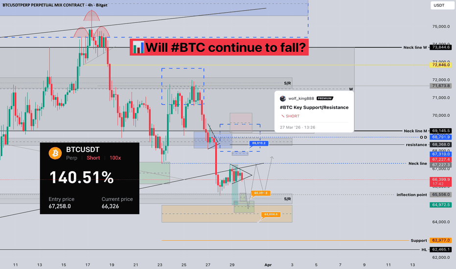 📊Will #BTC continue to fall? From a structural perspective, we are still in a downward - trend, and the downward risk has not been lifted. Currently, we are hindered by the neck - line and also by the lower edge of the ascending wedge. Be wary of the risk of continuous decline. If we want to reverse the downward trend, we need to construct a bull structure of the same cycle near 65,000 (as shown in the black dashed trajectory in the diagram). The short - term support is near 65,600, and a good support is near 64,000. If there is no further decline, the resistance level worthy of our attention is near 68,000. 🤜If you like my analysis, please like💖 and share💬 BITGET:BTCUSDT.P... Read more -