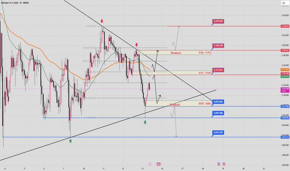 - After a sharp decline from the resistance zone (5186 - 5193), the price is currently moving within a converging triangle pattern between the descending and ascending trendlines. This is typically a period of liquidity consolidation before a strong breakout to determine the next trend. - The EMA (H4) maintains a medium-term uptrend structure as EMA 34 remains above EMA 89. However, the EMA (H2 - H1 - M30) indicates a short-term downtrend as EMA 34 is below EMA 89; the timeframes are not converging on the structure. - The (5186 - 5193) zone is currently a crucial resistance area; a breakout of this zone would lead to a stronger upward momentum. The (5078 - 5086) zone is currently a crucial support area; a breakout of this zone would open up a wider downward movement in the market. ✅ VIEW: 1. BUY SCENARIO: - If the price breaks through the... Read more
