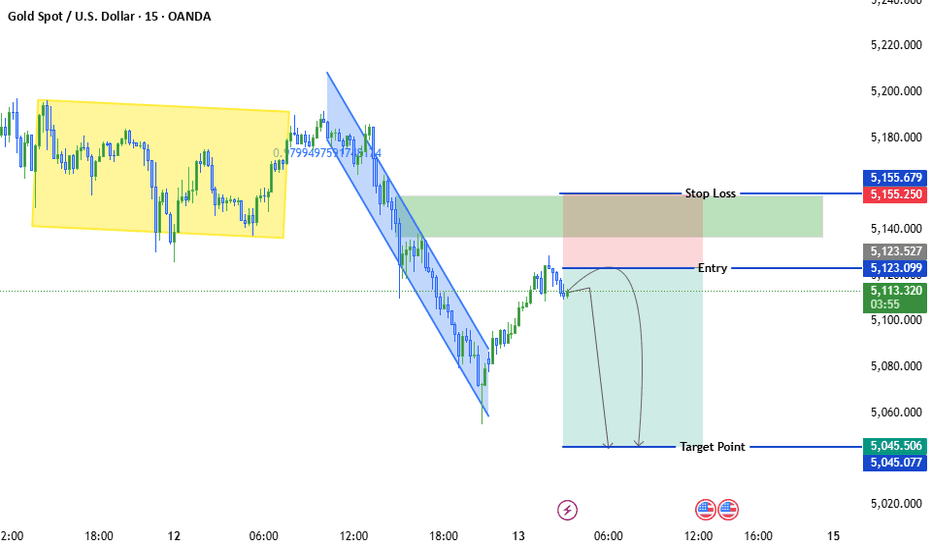 Price previously moved inside a sideways accumulation range (yellow box). A strong bearish breakout occurred from that range. After the breakout, price formed a descending channel showing strong selling pressure. The market then made a retracement upward toward a supply zone. This suggests the move is likely a bearish continuation after a pullback. Key Trading Zone Entry Area: ~ 5123 This level aligns with: Previous intraday support turned resistance Channel retest Liquidity pullback area Smart money often sells from these retracement zones. Trade Idea Sell Setup Entry: 5123 Stop Loss: 5155 Target: 5045 Risk-to-Reward is roughly 1:2.5, which is solid for an intraday setup.... Read more -