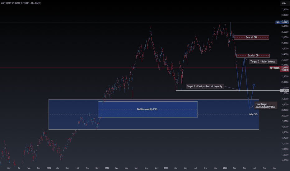NIFTY futures are currently showing broad multi-timeframe weakness, with price reacting strongly from a higher-timeframe supply zone. The rejection from this area suggests institutional distribution and growing selling pressure across multiple timeframes. Recent price action indicates a loss of bullish momentum, with the market beginning to rotate toward lower liquidity zones. Multi-Timeframe Perspective Daily Timeframe :Price rejected a bearish Order Block, indicating supply dominance at higher levels. Market structure shows loss of upside continuation after failing to sustain new highs. Intermediate Timeframe :Momentum indicators and trend structure suggest continued downside pressure as sellers remain active. Lower Timeframes :Price is forming lower highs with expanding downside impulses, reinforcing the broader bearish bias. This alignment across multiple timeframes suggests that selling pressure is not isolated but part of a broader distribution phase. Key Technical Observations 1.Bearish Reaction from Institutional Supply Price reacted from a bearish Order Block zone, often associated with institutional... Read more -