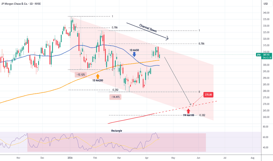 JP Morgan Chase (JPM) has been trading within a Channel Down since its January 05 Top. Yesterday the price hit the top (Lower Highs trend-line) of this pattern and gave a strong Sell Signal. With the 1D MA50 (blue trend-line) and the 1D MA200 (orange trend-line) having already formed a 1D Death Cross, this amplifies the sell opportunity, which can technically do another -0.382 Fibonacci test. Since however this time the 1W MA100 (red trend-line) is in between, the Target should be that Support, and we expect it to be at $270. --- ** Please LIKE 👍, FOLLOW ✅, SHARE 🙌 and COMMENT ✍ if you enjoy this idea! Also share your ideas and charts in the comments section below! This is best way to keep it relevant, support us, keep the content here free and allow the idea to reach as many people as possible. ** --- 💸💸💸💸💸💸 👇... Read more -