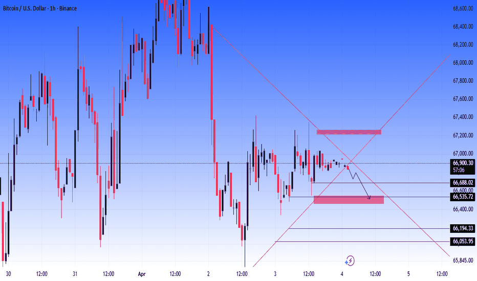 Bitcoin is currently trading in a tight consolidation range after a sharp bearish move, showing signs of indecision on the 1H timeframe. Price is respecting a clear horizontal resistance zone around 67,200 and a support zone near 66,500. The structure suggests a possible distribution phase, with lower highs forming inside the range. If price continues to reject the upper boundary, we could see a breakdown below support, targeting the next key levels around 66,200 – 66,000. 🔍 Key Points: Strong resistance holding at the top of the range Weak bullish momentum with choppy price action Liquidity likely resting below the range lows Bearish bias while price stays below resistance 📌 Trade Idea: Look for short entries on rejection from resistance Confirmation on breakout below 66,500 Targets: 66,200 → 66,000 Invalidation: Clean breakout above resistance ⚠️ Always wait for confirmation and manage risk properly.... Read more -
