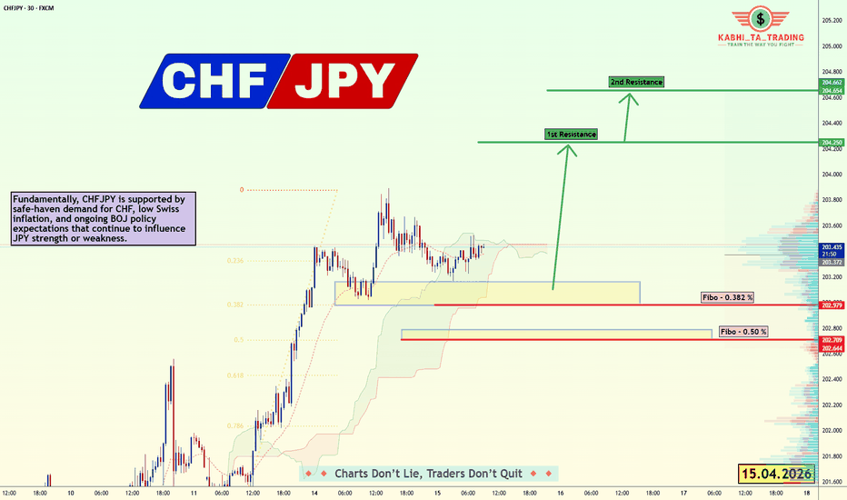 Setup Overview: FX:CHFJPY CHFJPY is showing signs of strength after a strong impulsive move higher, followed by a healthy retracement into an important support zone. Price is currently holding above the Fibonacci retracement area, with the 0.382 level near 202.979 and the 0.50 level near 202.709 acting as the main demand zone. This pullback looks like a possible continuation setup rather than a reversal, as price remains structurally bullish on the intraday view. The highlighted zone could offer buyers a strong reaction point if price dips lower before continuation. As long as CHFJPY stays supported above this area, the bullish outlook remains valid. Support & Resistance: Main Support Zone: 202.70 β 202.98 Current Price Area: around 203.43 1st Resistance: 204.250 2nd Resistance: 204.654 A successful hold above support may trigger a move toward the first resistance at 204.250, and if momentum continues, price could extend toward 204.654. Disclaimer: This analysis... Read more -
