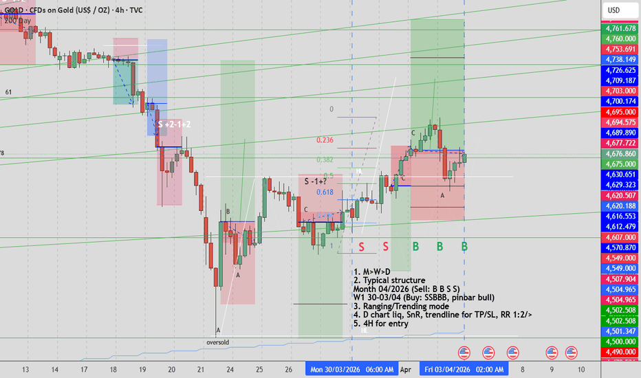 1. M >W >D 2. Typical structure Month 04/2026 (Sell: B B S S) W1 30-03/04 (Buy: SSBBB, pinbar bull) 3. Ranging/Trending mode 4. D chart liq, SnR, trendline for TP/SL, RR 1:2/ > 5. 4H for entry... Read more -