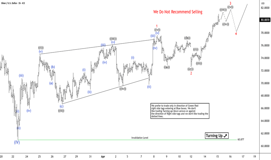Silver (XAGUSD) rallied to $121.6 on January 29 before entering a sharp decline that reached $60.87. We identified that decline as wave (IV) in the Super Cycle degree, and the broader structure continues to support a constructive longβterm outlook. The metal has begun to recover from the wave (IV) low, and the next important test is a break above the wave (III) allβtime high at $121.6. A clean break would remove the risk of a double correction and confirm that a new cycle is underway. From the wave (IV) low, wave 1 formed a leading diagonal and finished at $77.63. Wave 2 then retraced to $72.57 before the metal turned higher again in wave 3. The current structure suggests that one more push is needed to complete wave 3. After that advance, a wave 4 pullback should develop to correct the cycle from the April 13, 2026 low. A final... Read more -