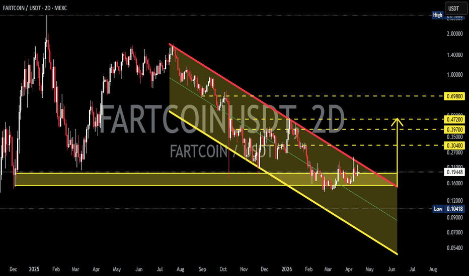 On the 2D timeframe, FARTCOIN/USDT is clearly moving within a downtrend structure, characterized by consistent lower highs and lower lows. Price is currently trading inside a well-defined descending channel. The yellow zone (0.189 β 0.154) acts as a strong demand area / key support, which has held multiple times against further downside. Meanwhile, the upper red trendline serves as a dynamic resistance, continuously pushing the price downward. --- π Chart Pattern 1. Descending Channel (Bearish Structure) Formed by consistent lower highs and lower lows Upper red line = resistance Lower yellow line = support Price is currently near channel support β compression phase β‘οΈ This phase often precedes a major directional move --- 2. Falling Wedge (Potential Reversal) Inside the larger channel, a smaller falling wedge structure is visible: Price range is tightening Selling pressure is weakening Typically considered a bullish reversal pattern --- π Key Levels Major Support: 0.189... Read more -