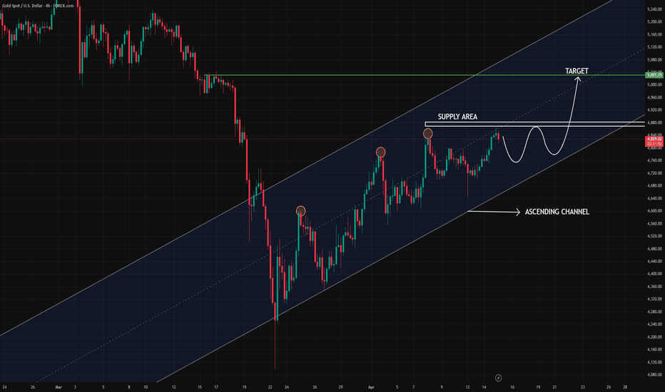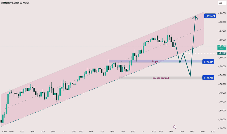 XAUUSD Market Structure Update Price is currently trading around the 4,830 level, continuing its bullish movement within a well-defined ascending channel after a strong reversal from the lows. This suggests the market is in a sustained bullish structure, approaching a key supply area. β€ Market Structure β’ Clear Higher Highs (HH) & Higher Lows (HL) β confirms bullish market structure. β’ Price is respecting a clean ascending channel, indicating controlled institutional buying. β’ Multiple rejections from supply (~4,850 β 4,880) show liquidity resting above. β’ Current move is forming another HL β pushing toward supply again. β’ Market likely building pressure for a Buy Side Liquidity (BSL) breakout. β€ Key Levels β’ Supply Zone: 4,850 β 4,880 β’ Current Price: ~4,830 β’ Channel Support (HL zone): 4,700 β 4,750 β’ Demand Zone: 4,600 β 4,650 β’ Buy Side Liquidity (BSL): above 4,880 If price holds above the 4,750 β 4,700... Read more -