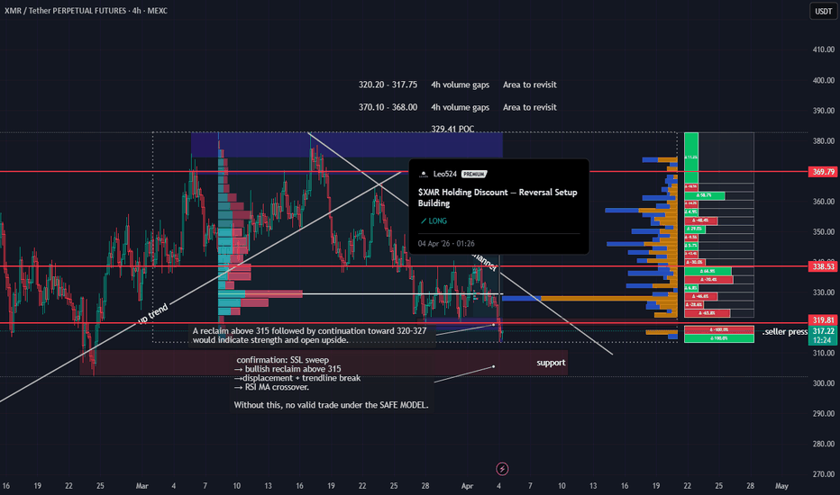 Sell-side liquidity rests below 310, and a deeper sweep into the demand zone is likely before any reversal. The current compression near support, combined with trendline pressure, suggests a final liquidity grab could occur before price shifts direction. Delta volume remains negative, reflecting aggressive selling, but this also signals potential overcrowding. 329.41 (POC) would indicate strength and open upside. confirmation: SSL sweep → bullish reclaim above supportzone → displacement + trendline break → RSI MA crossover. Without this, no valid trade under the SAFE MODEL. Analysis by Leo524. Reanalyze by Halios/Chocolatte997 #XMR.... Read more -