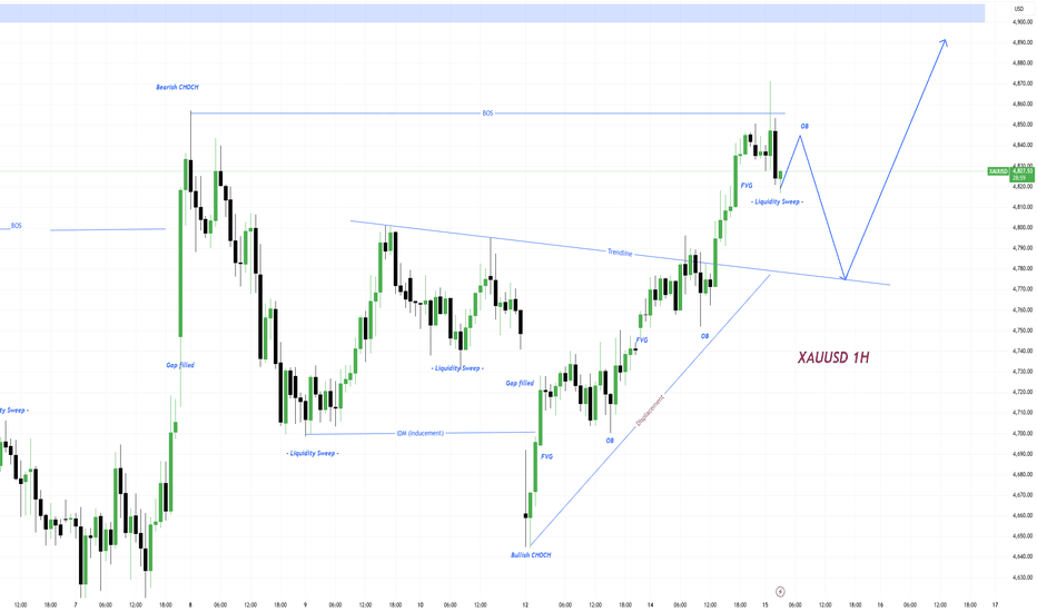 On the 1H timeframe, XAUUSD shows a clear Smart Money Concepts structure shifting from bearish to bullish. Initially, price formed a Bearish CHOCH, followed by a period of consolidation and multiple liquidity sweeps, indicating smart money accumulation. A strong Bullish CHOCH later confirms the shift in market structure, supported by displacement and the creation of Fair Value Gaps (FVGs) and Order Blocks (OBs). Price is currently trading above a rising trendline, respecting bullish structure. The recent move shows a liquidity sweep above short-term highs, suggesting a possible retracement before continuation. The marked FVG and OB zones act as key institutional interest areas where price may return to rebalance inefficiencies. Entry Points: Wait for price to retrace into the FVG or OB zone (around 4820β4800) Confirm entry with bullish confirmation (engulfing candle or BOS on lower timeframe) Enter Buy after confirmation, not blindly at zone Stop Loss: Below the OB /... Read more -
