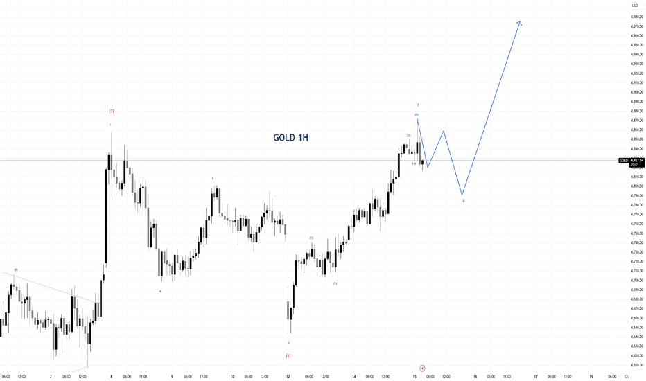 The XAUUSD 1H chart shows a clear Elliott Wave structure forming a bullish impulsive trend. Price appears to have completed a five-wave impulse to the upside, labeled (1) through (5), followed by the beginning of a corrective phase. Currently, the market is likely developing an ABC correction or a smaller degree wave (II) after finishing wave (I). The strong bullish momentum from the recent lows indicates institutional buying pressure. Wave (3) was extended, showing strength, while wave (4) formed a shallow consolidation. The recent peak near wave (5) suggests a temporary top, and the projected path indicates a pullback before continuing upward toward a new high. Entry Strategy: Wait for price to complete the corrective move (wave II or B), ideally around a support zone or Fibonacci retracement (0.5β0.618). Look for confirmation such as bullish engulfing candles or market structure break (BOS). Enter BUY after confirmation of reversal from the... Read more -